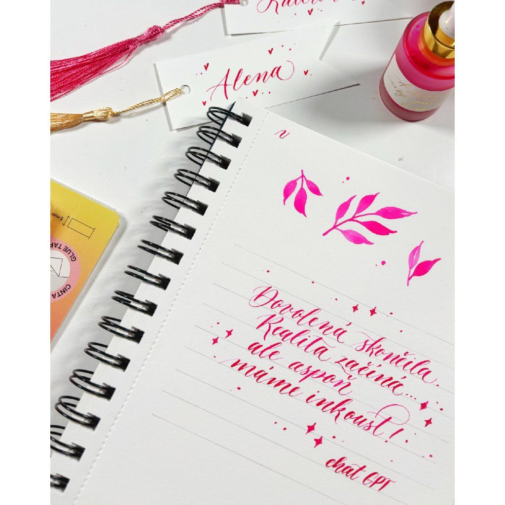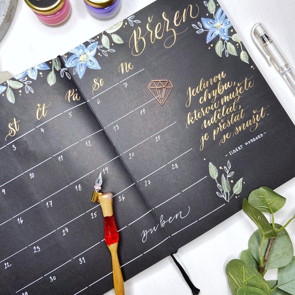 Ukážu vám, jak začít s tradičním kaligrafickým perem, jak si poradit s prvními tahy, a pak přidáme barvy – namalujeme si jemný akvarelový věneček a zkusíme si psát akvarelovými barvami pomocí štětce i pera. Všechno si vyzkoušíte v klidu a vlastním tempem – i když s kaligrafií teprve začínáte.